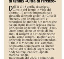 1904, 2022 Toscana Oggi 10.4.2022. Dopo due anni torna il torneo giovanile di tennis “Città di Firenze”CT Firenze2023-04-07T14:18:59+02:00Aprile 19th, 2022|