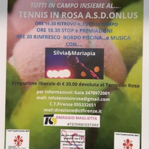 Alle 17:00 inizierà l’evento benefico con la formazione delle coppie che avranno una “tennista in rosa” e un altro giocatore o giocatrice. “Queste signore – spiega Cristina Isidori – avendo avuto operazioni invasive devono giocare con palline depressurizzate e hanno la possibilità di colpirle al secondo balzo. Faremo dei tie break con le 25 signore in rosa e i 36, uomini e donne, che si sono iscritti a giocare con loro”. Alle 19:00, sul Campo 4, avrà luogo la premiazione e verrà consegnata una targa al Presidente del CT Firenze Carlo Pennisi che sancisce l’adesione del Circolo all’Associazione Tennis in Rosa. Un sostegno che prevede che “le giocatrici – conferma Cristina Isidori – una volta alla settimana seguano le lezioni sui campi del Circolo. Dopo la premiazione è stata organizzata una cena a buffet, sponsorizzata da ChiantiBanca, cui seguirà un particolare intrattenimento musicale che vedrà protagoniste due cantanti, Silvia e Mariapia. Silvia è l'unica cantante in Italia autorizzata da Gianna Nannini a cantare le sue canzoni ed ha una voce incredibilmente simile alla sua”.